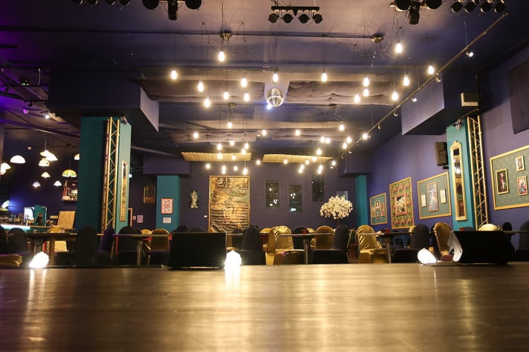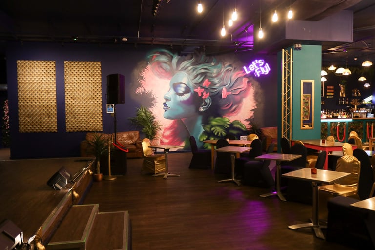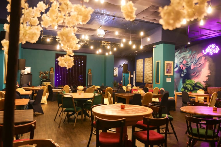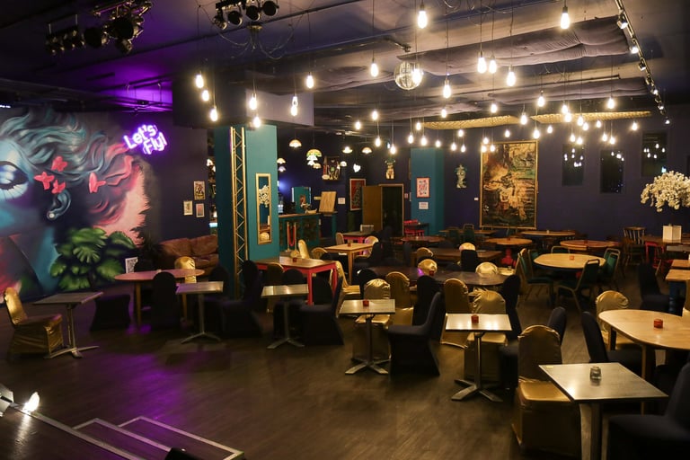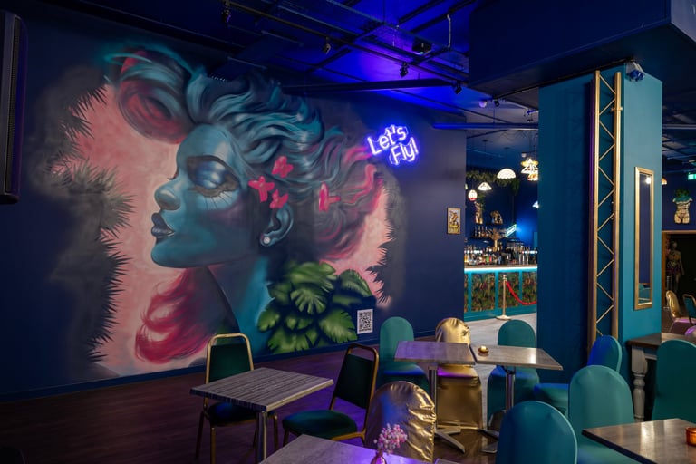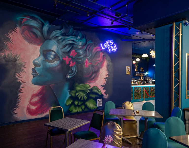 Located in the heart of town, The Dragonfly Lounge is a stunning venue for weddings, parties, and private events. Its rich sapphire walls, striking artwork, and warm lighting create a timeless, elegant atmosphere with a modern twist.